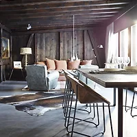 Plum purple units and breakfast bar stools give an unusual edge to this kitchen. The juicy hue warms up the predominantly cream décor.